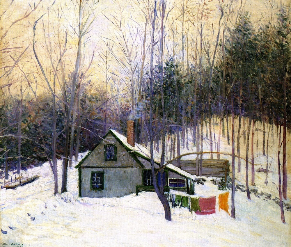 Nous vous proposons une reproduction artisanale sur toile du célèbre tableau 'Un lundi enneigé' de Lilla Cabot Perry, provenant du Musée de la Reproduction.