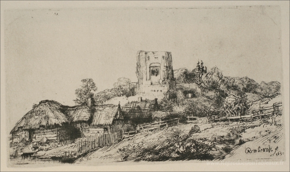 Nous vous proposons une reproduction artisanale sur toile du célèbre tableau 'Un village avec une tour carrée' de Rembrandt, provenant du Musée de la Reproduction.