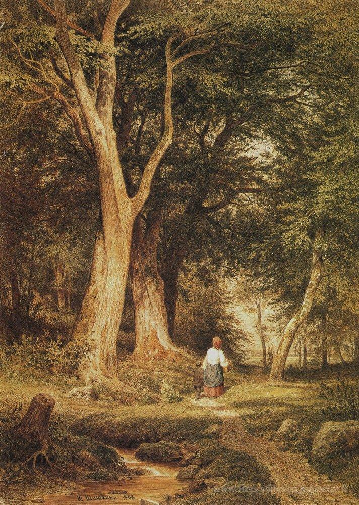 Nous vous proposons une reproduction artisanale sur toile du célèbre tableau 'Une femme avec un garçon dans la forêt' de Ivan Shishkin, provenant du Musée de la Reproduction.