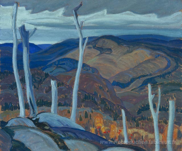 Nous vous proposons une reproduction artisanale sur toile du célèbre tableau 'Une journée grise' de Franklin Carmichael, provenant du Musée de la Reproduction.