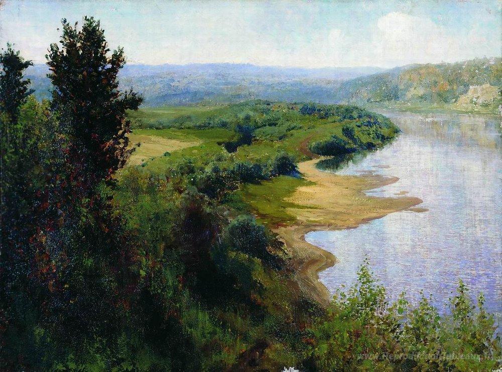 Nous vous proposons une reproduction artisanale sur toile du célèbre tableau 'Une rivière' de Vasily Polenov, provenant du Musée de la Reproduction.
