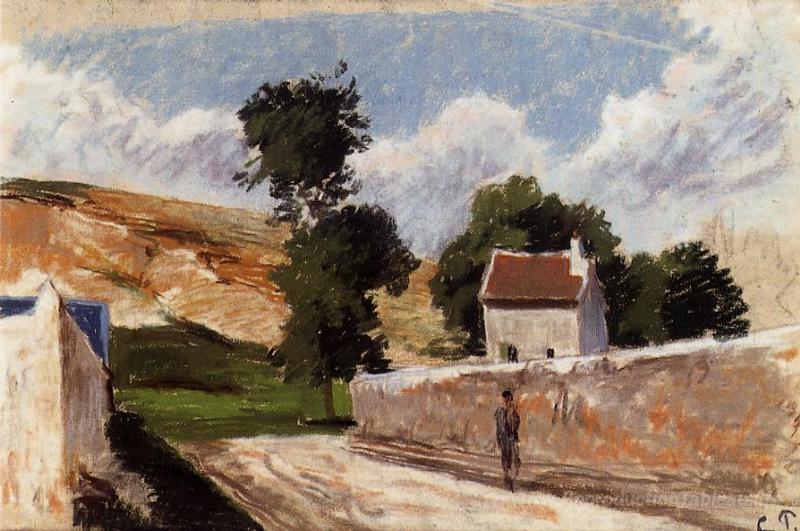 Nous vous proposons une reproduction artisanale sur toile du célèbre tableau 'Une rue à L'Hermitage, Pontoise' de Camille Pissarro, provenant du Musée de la Reproduction.