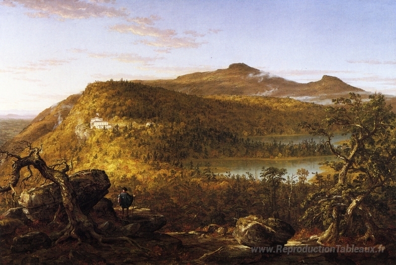 Nous vous proposons une reproduction artisanale sur toile du célèbre tableau 'Une vue sur les deux lacs et la montagne, les montagnes Catskill' de Thomas Cole, provenant du Musée de la Reproduction.