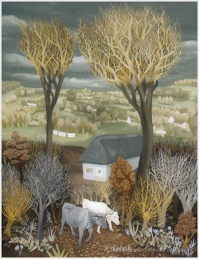 Nous vous proposons une reproduction artisanale sur toile du célèbre tableau 'Vaches dans les bois' de Ivan Generalic, provenant du Musée de la Reproduction.