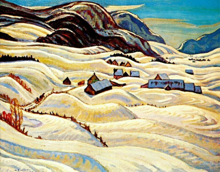 Nous vous proposons une reproduction artisanale sur toile du célèbre tableau 'Vallée de la rivière Gouffre' de A.Y. Jackson, provenant du Musée de la Reproduction.