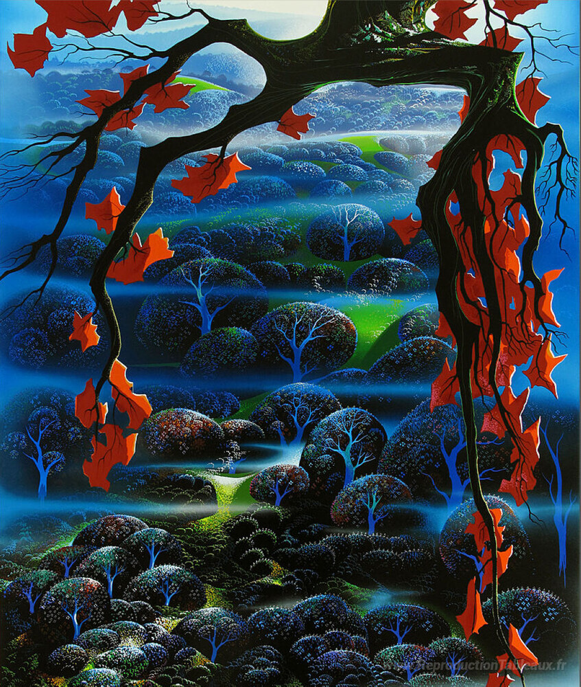 Nous vous proposons une reproduction artisanale sur toile du célèbre tableau 'Vallée des rêves' de Eyvind Earle, provenant du Musée de la Reproduction.