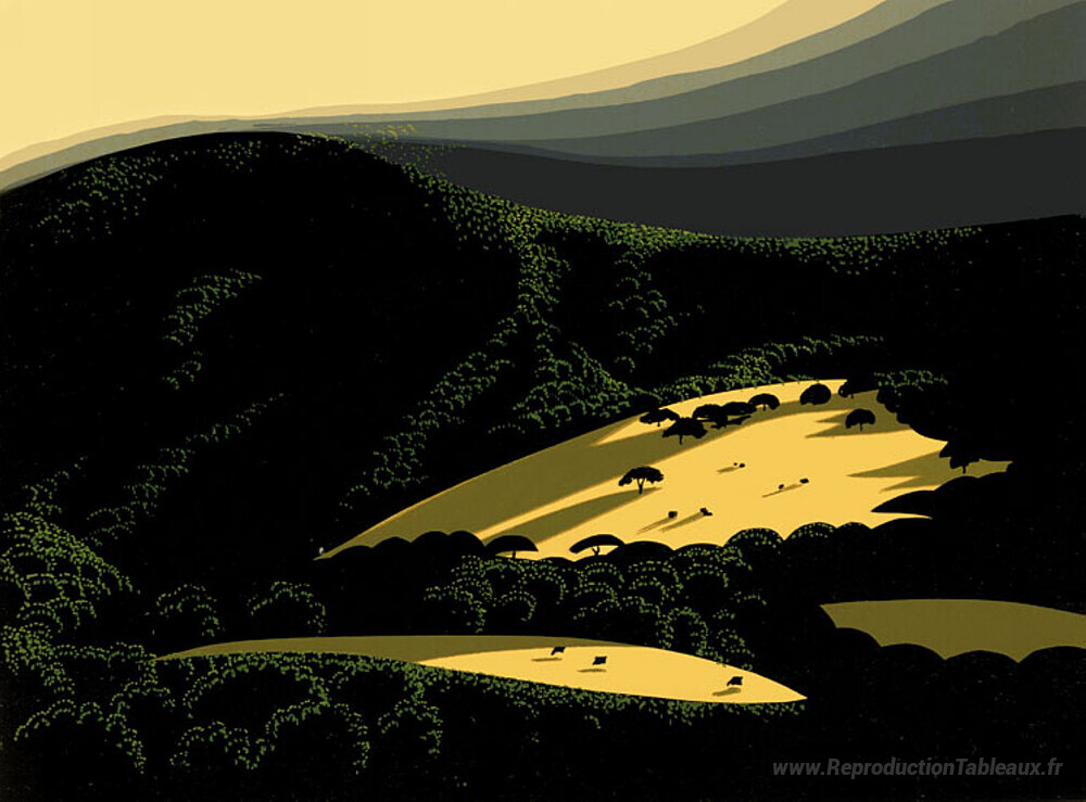Découvrez l'envoûtante beauté de la peinture à l'huile au travers de l'œuvre magistrale Valle ancora de l'artiste visionnaire Eyvind Earle. Réputé pour son style graphique et ses paysages enchanteurs, Earle réussit à capturer des scènes de nature qui transcendent le quotidien. Sa technique raffinée, qui mêle lignes précises et palettes vibrantes, donne vie à des compositions à la fois sereines et dynamiques, invitant chaque observateur à une rêverie contemplative.
