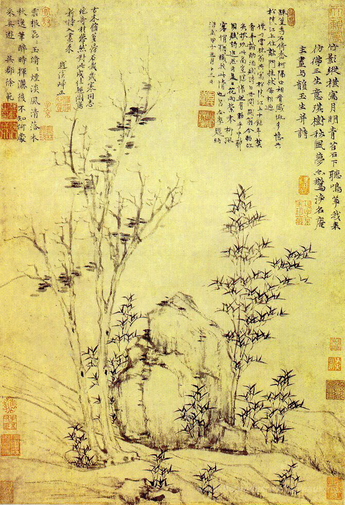 Nous vous proposons une reproduction artisanale sur toile du célèbre tableau 'Vent d'automne dans les arbres de pierres précieuses' de Ni Zan, provenant du Musée de la Reproduction.