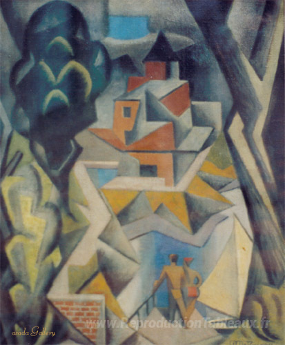 Nous vous proposons une reproduction artisanale sur toile du célèbre tableau 'Village, église et deux personnages' de Jean Metzinger, provenant du Musée de la Reproduction.
