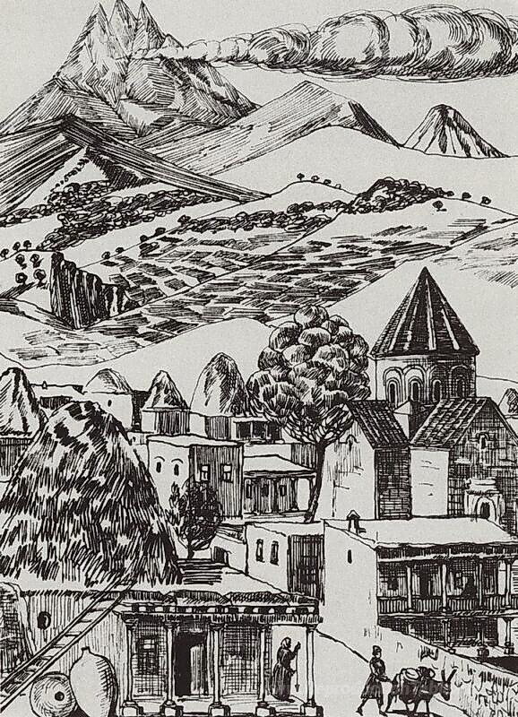 Nous vous proposons une reproduction artisanale sur toile du célèbre tableau 'Village arménien' de Martiros Saryan, provenant du Musée de la Reproduction.