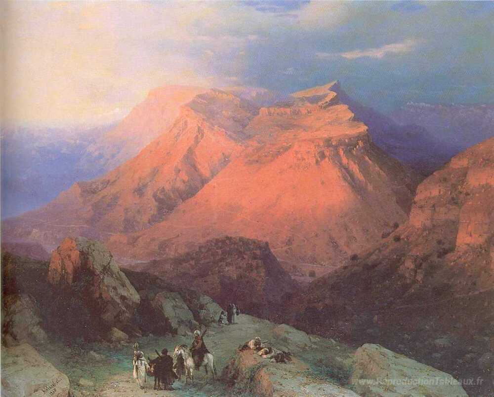 Découvrez l’exceptionnelle reproduction de la peinture à l'huile Village de montagne Gunib à Daghestan View de l'est, signée par le maître Ivan Aivazovsky. Cet artiste, reconnu pour son talent inégalé dans la représentation des paysages marins, s’épanouit également dans la capture des panoramas terrestres. À travers des coups de pinceau délicats et une palette de couleurs soigneusement choisie, Aivazovsky invite le spectateur à explorer la beauté des montagnes du Daghestan, évoquant à la fois la sérénité et la grandeur de la nature.