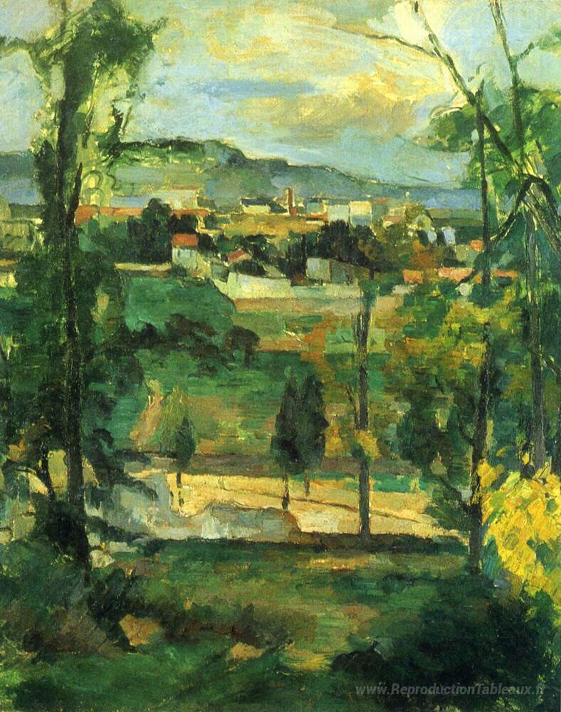 Nous vous proposons une reproduction artisanale sur toile du célèbre tableau 'Village derrière les arbres' de Paul Cezanne, provenant du Musée de la Reproduction.
