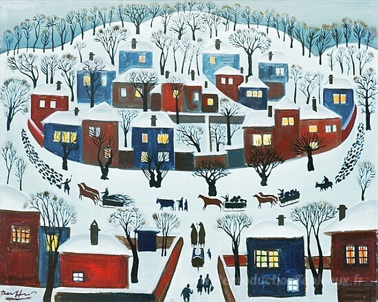 Nous vous proposons une reproduction artisanale sur toile du célèbre tableau 'Village d'hiver' de Radi Nedelchev, provenant du Musée de la Reproduction.