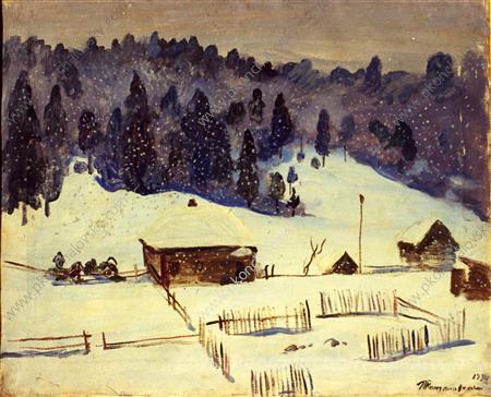 Nous vous proposons une reproduction artisanale sur toile du célèbre tableau 'Village Karzamanovo. La neige est partie.' de Pyotr Konchalovsky, provenant du Musée de la Reproduction.