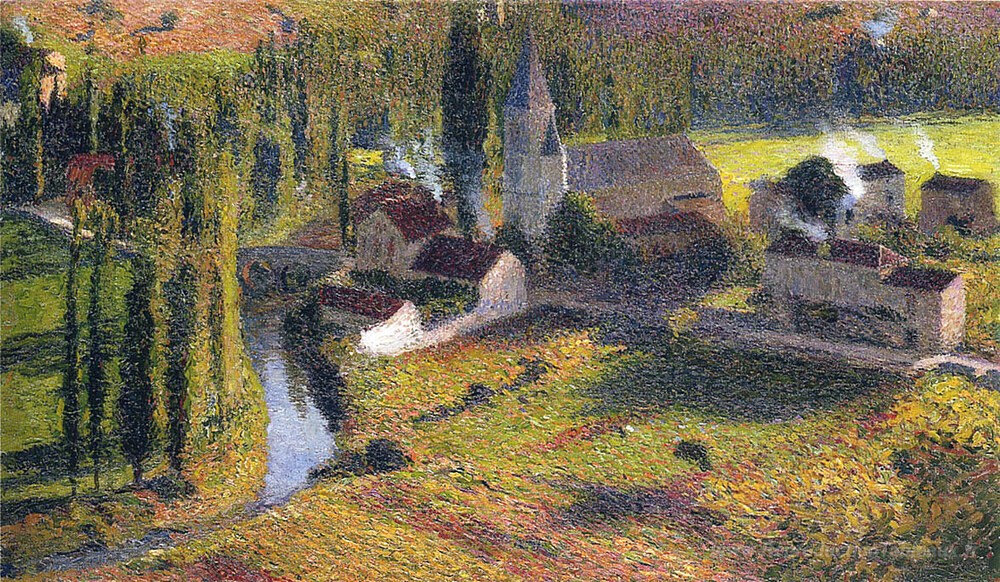 Nous vous proposons une reproduction artisanale sur toile du célèbre tableau 'Villaggio Labastide du Vert' de Henri Martin, provenant du Musée de la Reproduction.