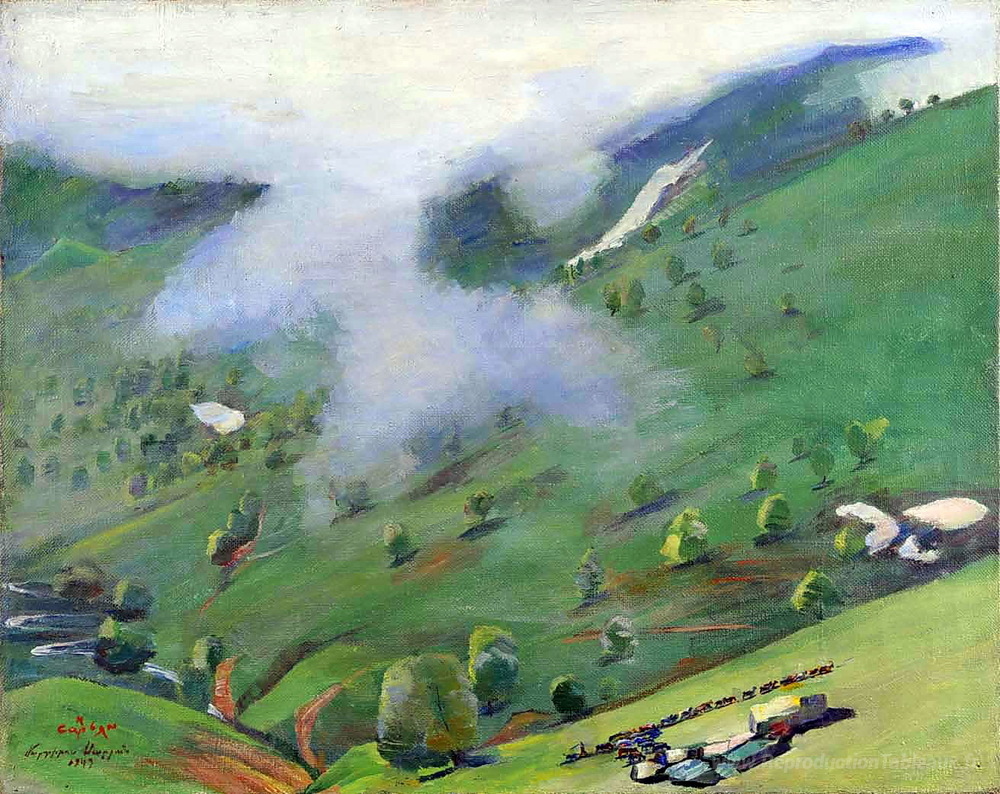 Nous vous proposons une reproduction artisanale sur toile du célèbre tableau 'Vue de la gorge du col de la poussette' de Martiros Saryan, provenant du Musée de la Reproduction.