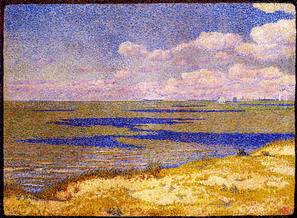 Nous vous proposons une reproduction artisanale sur toile du célèbre tableau 'Vue de la rivière Scheldt' de Theo van Rysselberghe, provenant du Musée de la Reproduction.