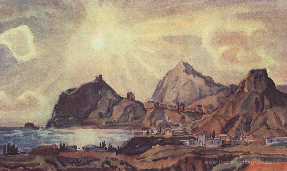 Nous vous proposons une reproduction artisanale sur toile du célèbre tableau 'Vue de Sudak' de Konstantin Bogaevsky, provenant du Musée de la Reproduction.