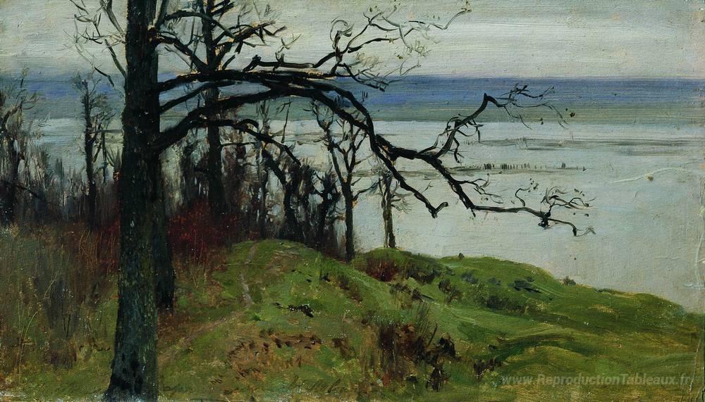 Nous vous proposons une reproduction artisanale sur toile du célèbre tableau 'Vue de Volga depuis la haute banque' de Isaac Levitan, provenant du Musée de la Reproduction.
