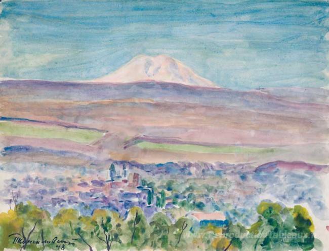Nous vous proposons une reproduction artisanale sur toile du célèbre tableau 'Vue d'Elbrus' de Pyotr Konchalovsky, provenant du Musée de la Reproduction.