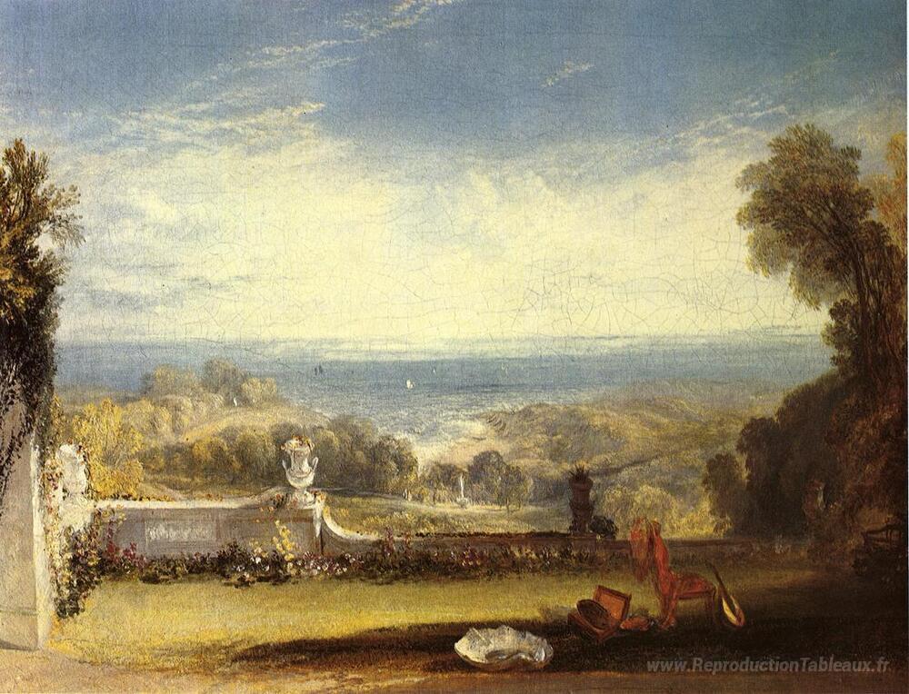 Nous vous proposons une reproduction artisanale sur toile du célèbre tableau 'Vue depuis la terrasse d'une villa à Niton, île de Wight' de William Turner, provenant du Musée de la Reproduction.