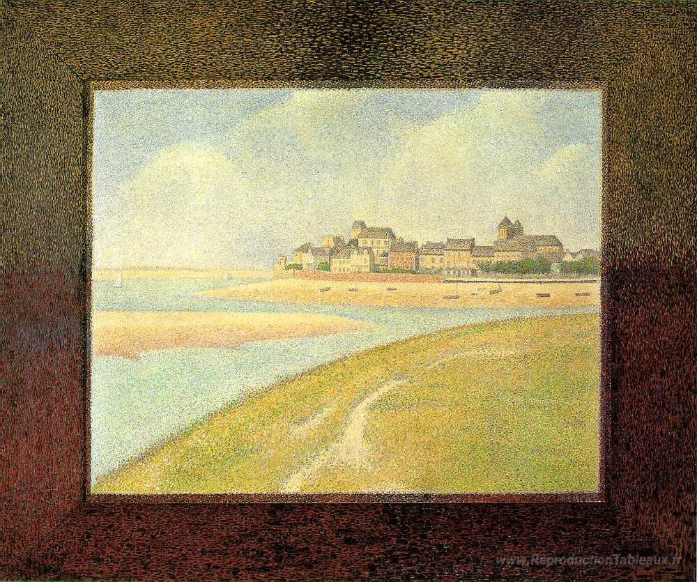 Nous vous proposons une reproduction artisanale sur toile du célèbre tableau 'Vue du Crotoy, depuis en amont' de Georges Seurat, provenant du Musée de la Reproduction.
