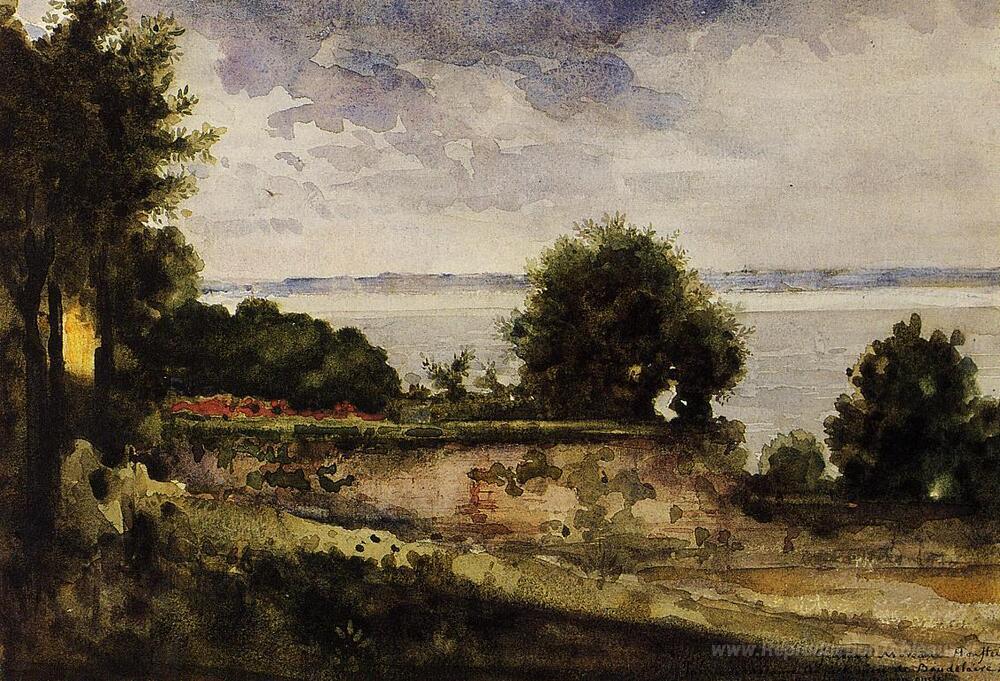 Nous vous proposons une reproduction artisanale sur toile du célèbre tableau 'Vue du Jardin de Madame Upick, mère de Baudelaire' de Gustave Moreau, provenant du Musée de la Reproduction.
