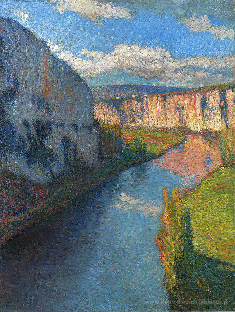 Nous vous proposons une reproduction artisanale sur toile du célèbre tableau 'Vue du lot de Saint-Cirq Lapopie' de Henri Martin, provenant du Musée de la Reproduction.