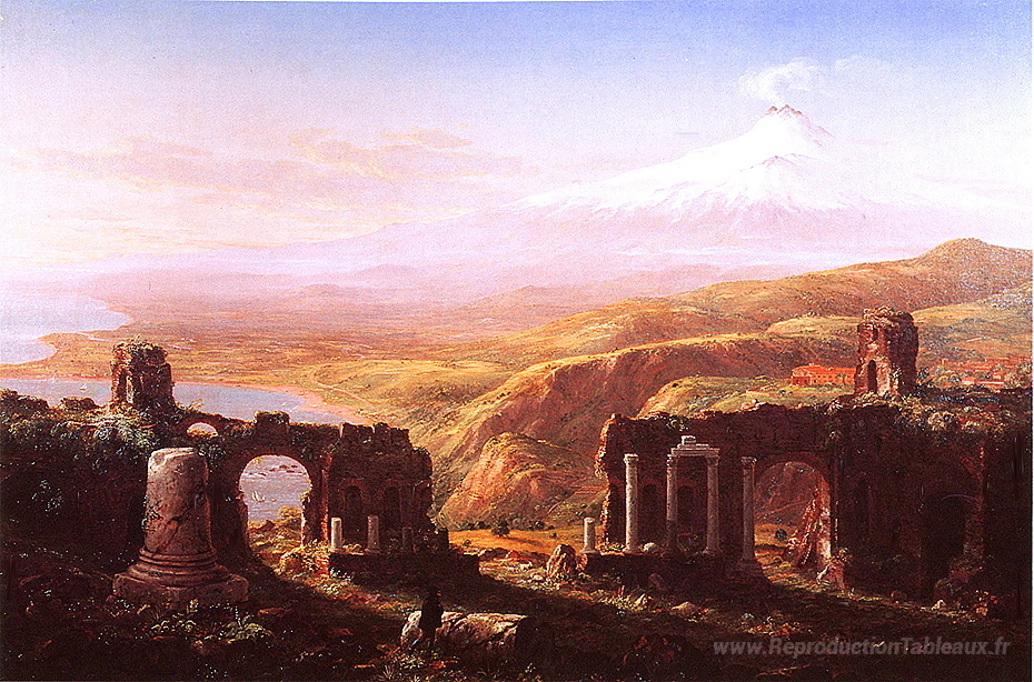 Nous vous proposons une reproduction artisanale sur toile du célèbre tableau 'Vue du mont Etna de Taormina' de Thomas Cole, provenant du Musée de la Reproduction.