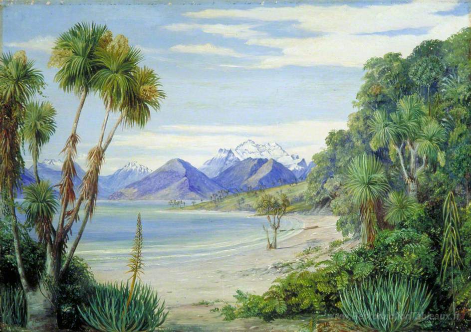 Nous vous proposons une reproduction artisanale sur toile du célèbre tableau 'Vue sur le mont Earnshaw depuis l'île du lac Wakatipe, en Nouvel' de Marianne North, provenant du Musée de la Reproduction.