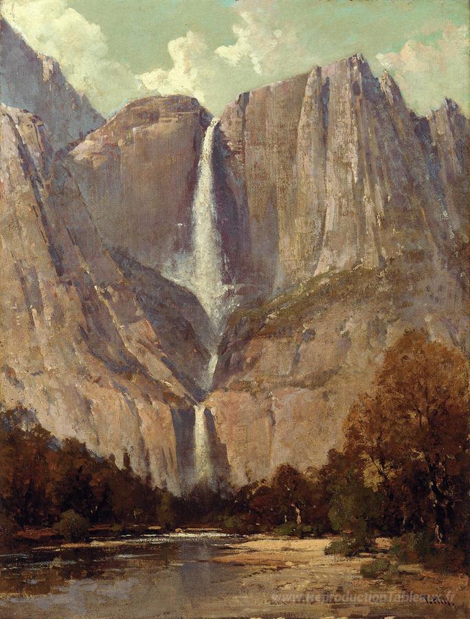 Nous vous proposons une reproduction artisanale sur toile du célèbre tableau 'Yosemite Falls' de Thomas Hill, provenant du Musée de la Reproduction.