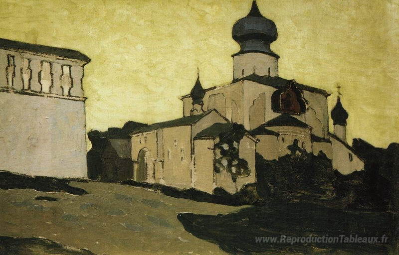 Nous vous proposons une reproduction artisanale sur toile du célèbre tableau 'Église de l'hypothèse à Pskov' de Nicholas Roerich, provenant du Musée de la Reproduction.