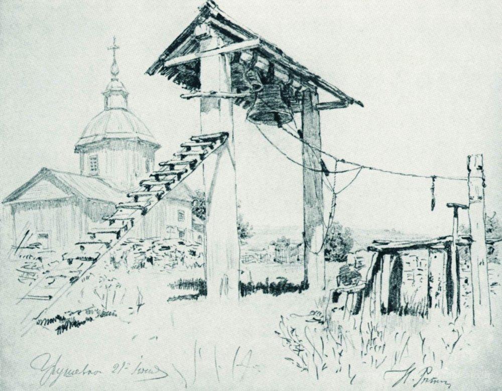 Nous vous proposons une reproduction artisanale sur toile du célèbre tableau 'Église et clocher à Chuguyev' de Ilya Repin, provenant du Musée de la Reproduction.