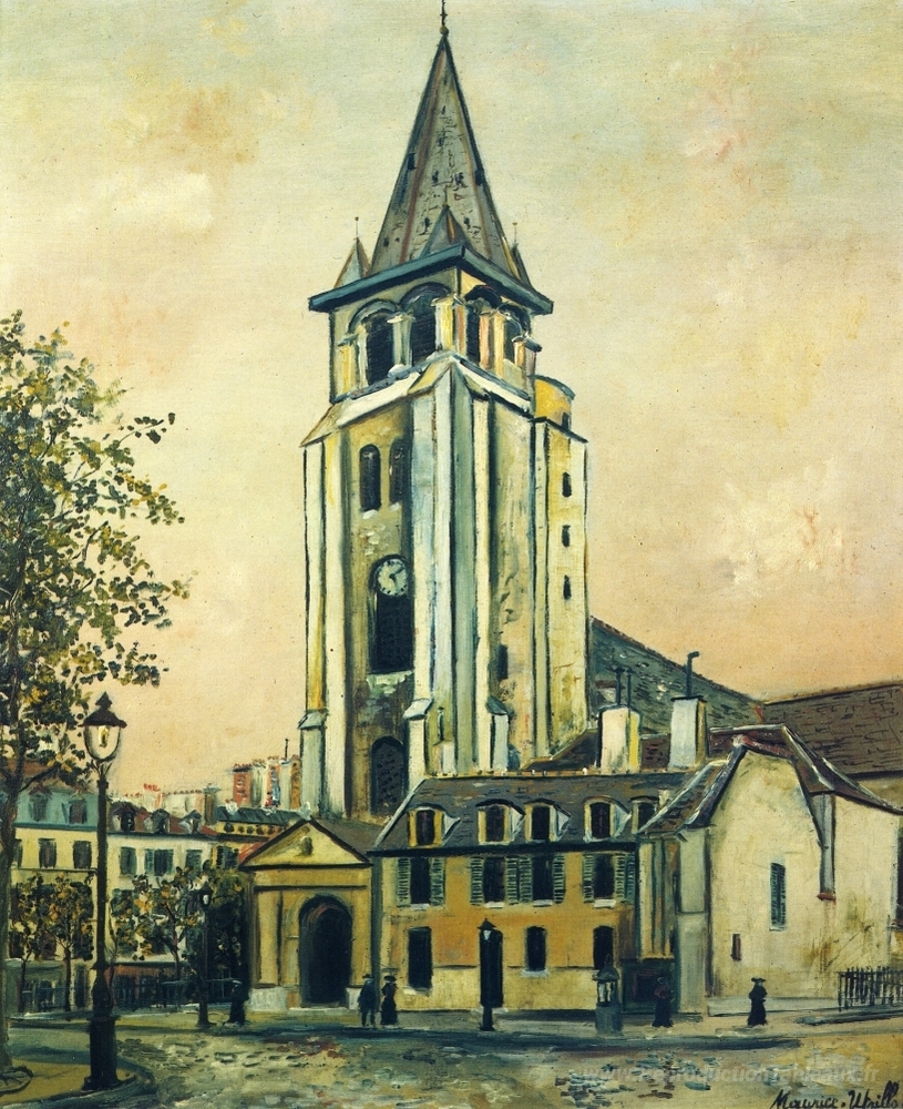Nous vous proposons une reproduction artisanale sur toile du célèbre tableau 'Église St. Germain' de Maurice Utrillo, provenant du Musée de la Reproduction.