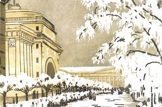 Nous vous proposons une reproduction artisanale sur toile du célèbre tableau 'Amirauté sous la neige' de Anna Ostroumova-Lebedeva, provenant du Musée de la Reproduction.