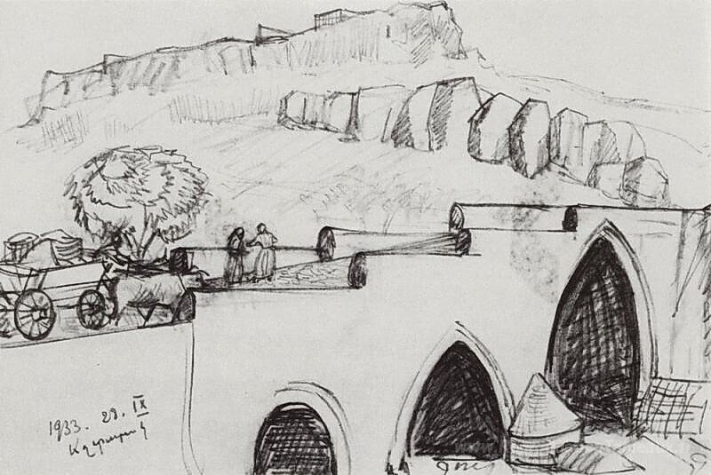 Nous vous proposons une reproduction artisanale sur toile du célèbre tableau 'Ashtarak' de Martiros Saryan, provenant du Musée de la Reproduction.