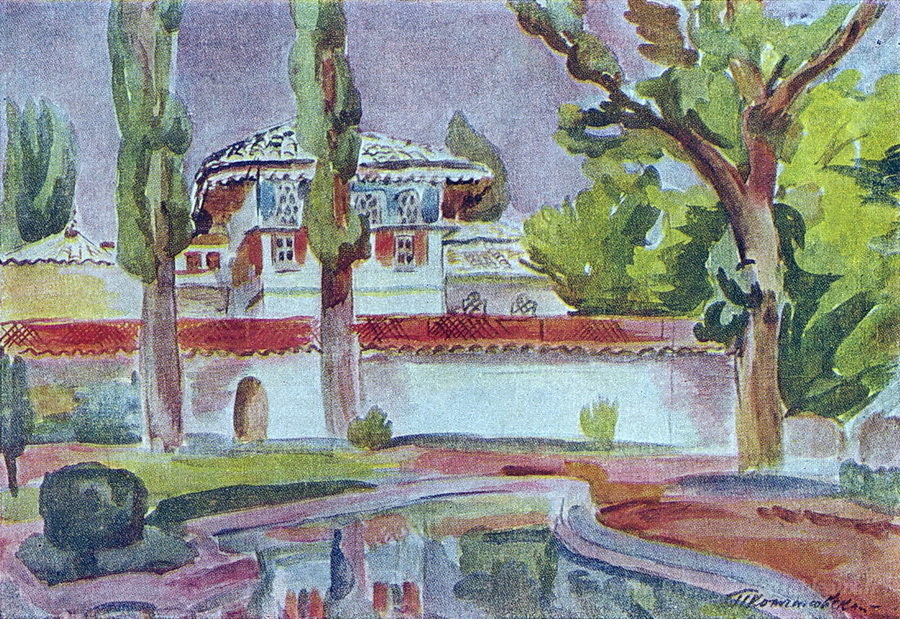 Nous vous proposons une reproduction artisanale sur toile du célèbre tableau 'Bakhchisarai. Le palais de Khan.' de Pyotr Konchalovsky, provenant du Musée de la Reproduction.