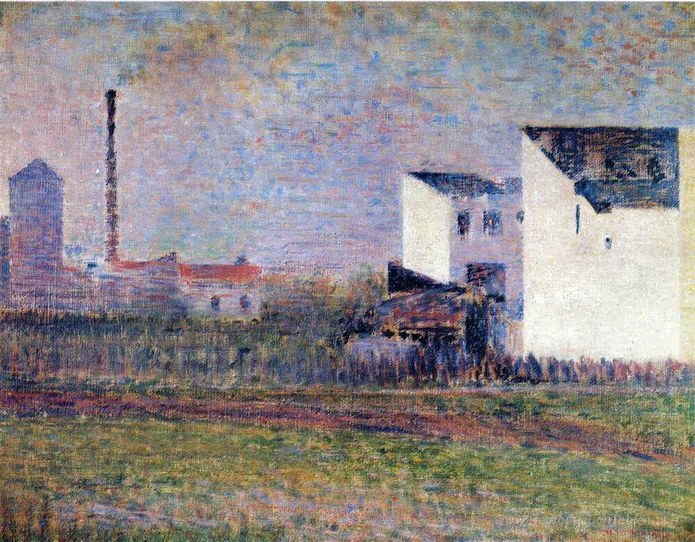 Nous vous proposons une reproduction artisanale sur toile du célèbre tableau 'Banlieue' de Georges Seurat, provenant du Musée de la Reproduction.
