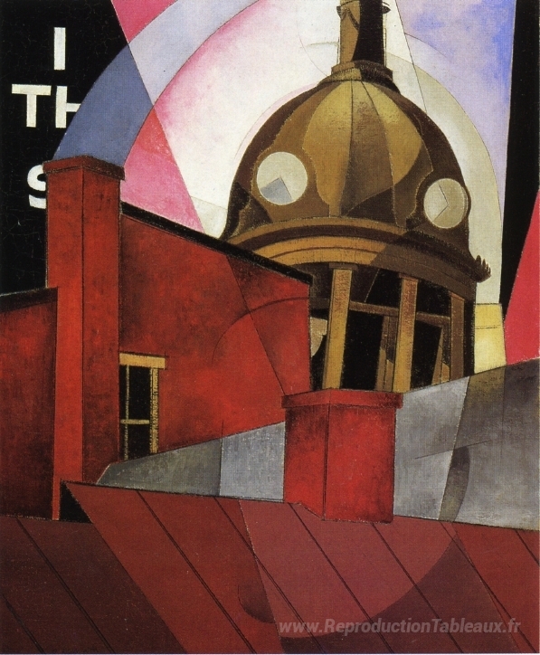 Nous vous proposons une reproduction artisanale sur toile du célèbre tableau 'Bienvenue dans notre ville' de Charles Demuth, provenant du Musée de la Reproduction.