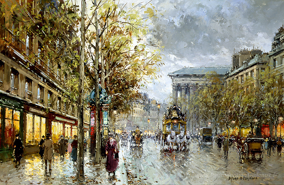 Nous vous proposons une reproduction artisanale sur toile du célèbre tableau 'Boulevard de la Madeleine' de Antoine Blanchard, provenant du Musée de la Reproduction.