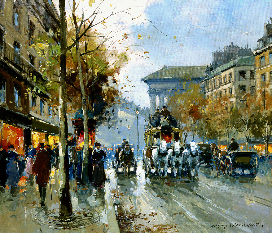 Nous vous proposons une reproduction artisanale sur toile du célèbre tableau 'Boulevard de la Madeleine' de Antoine Blanchard, provenant du Musée de la Reproduction.