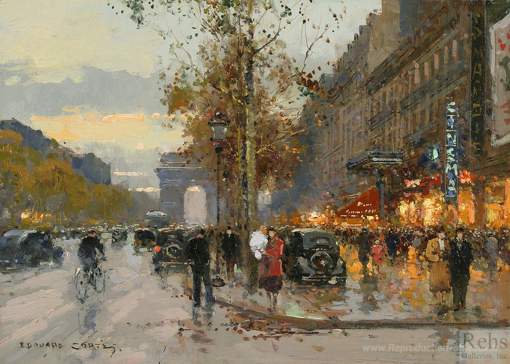 Nous vous proposons une reproduction artisanale sur toile du célèbre tableau 'Champs Élysées' de Edouard Cortes, provenant du Musée de la Reproduction.