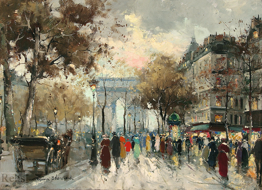 Nous vous proposons une reproduction artisanale sur toile du célèbre tableau 'Champs Élysées' de Antoine Blanchard, provenant du Musée de la Reproduction.