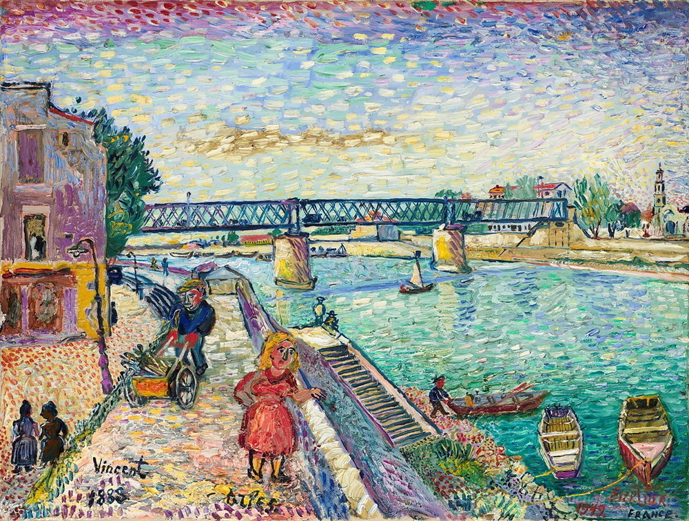 Nous vous proposons une reproduction artisanale sur toile du célèbre tableau 'Chiffres par une rivière' de David Burliuk, provenant du Musée de la Reproduction.