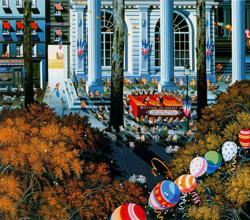 Nous vous proposons une reproduction artisanale sur toile du célèbre tableau 'Concert dans la ville' de Hiro Yamagata, provenant du Musée de la Reproduction.