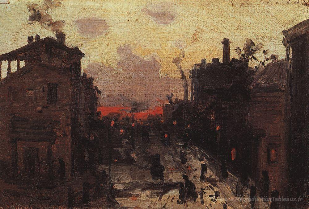 Nous vous proposons une reproduction artisanale sur toile du célèbre tableau 'Coucher de soleil à la périphérie de la ville' de Konstantin Korovin, provenant du Musée de la Reproduction.