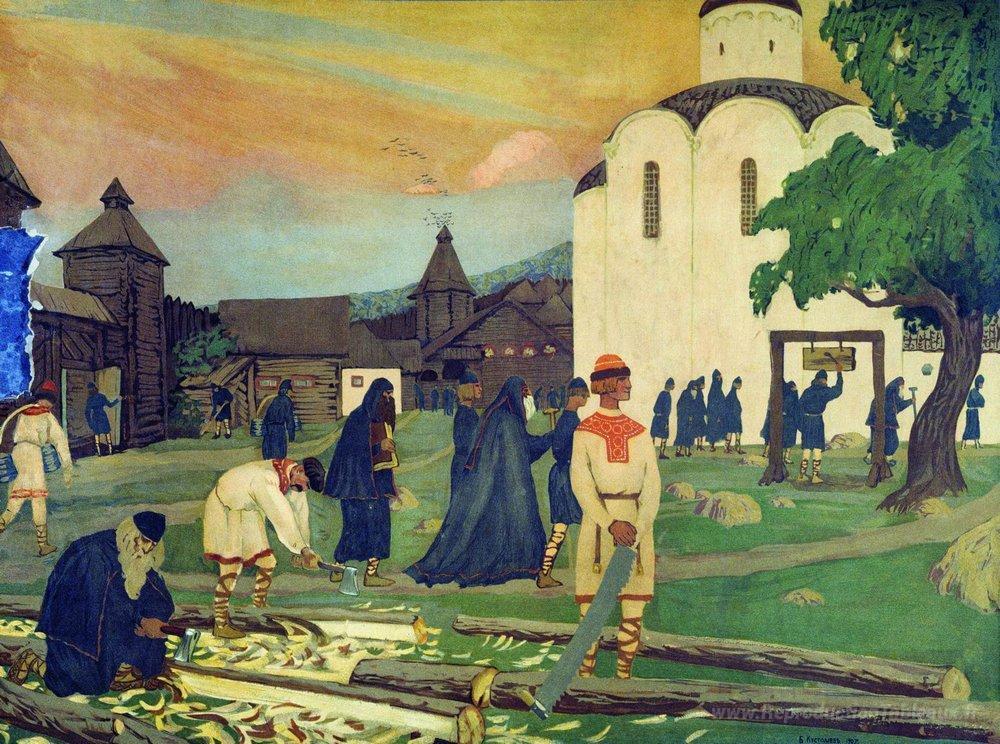 Nous vous proposons une reproduction artisanale sur toile du célèbre tableau 'Dans le monastère' de Boris Kustodiev, provenant du Musée de la Reproduction.