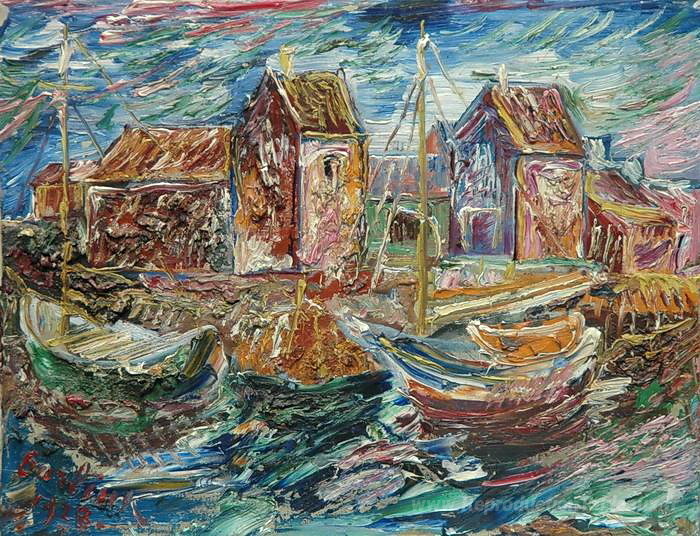 Nous vous proposons une reproduction artisanale sur toile du célèbre tableau 'Dans le port' de David Burliuk, provenant du Musée de la Reproduction.