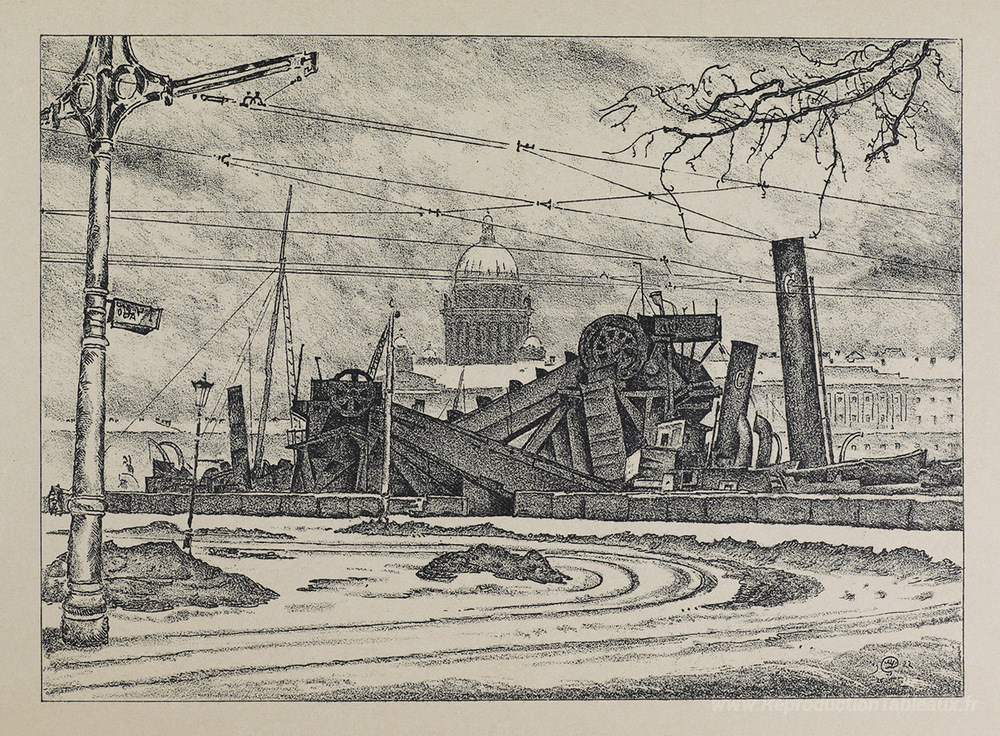 Nous vous proposons une reproduction artisanale sur toile du célèbre tableau 'Dragueur' de Mstislav Dobuzhinsky, provenant du Musée de la Reproduction.