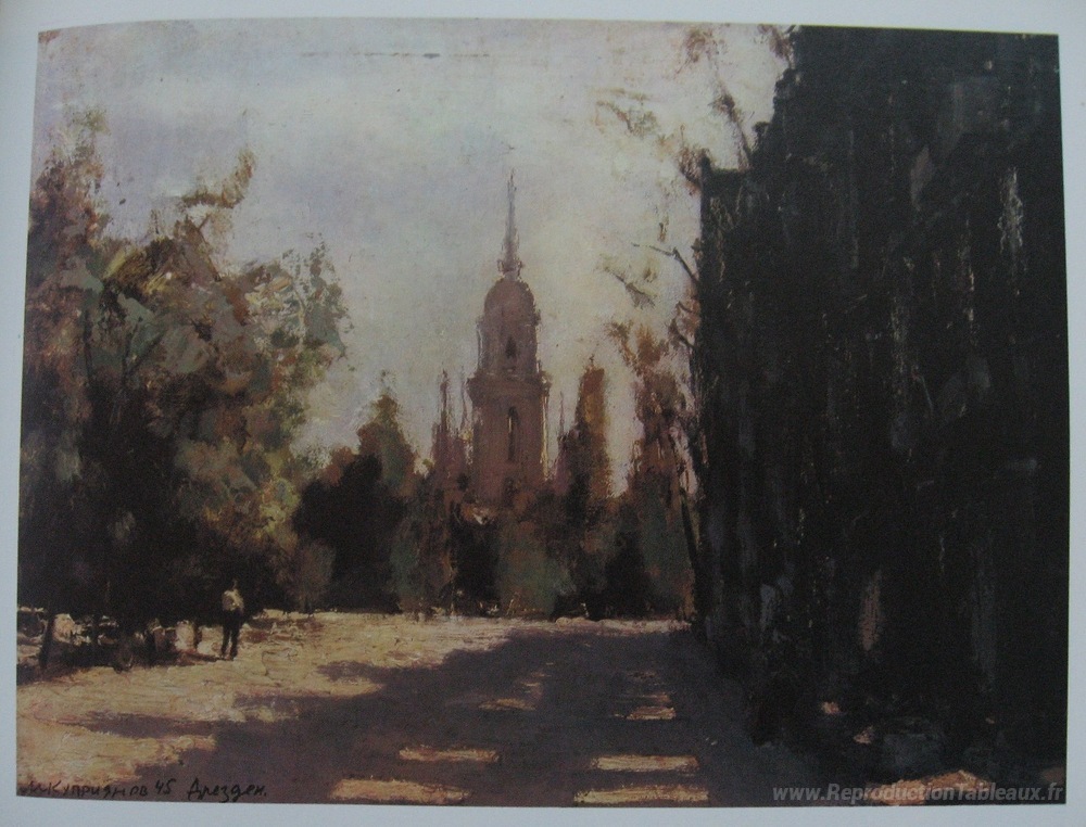 Nous vous proposons une reproduction artisanale sur toile du célèbre tableau 'Dresde' de Kukryniksy, provenant du Musée de la Reproduction.
